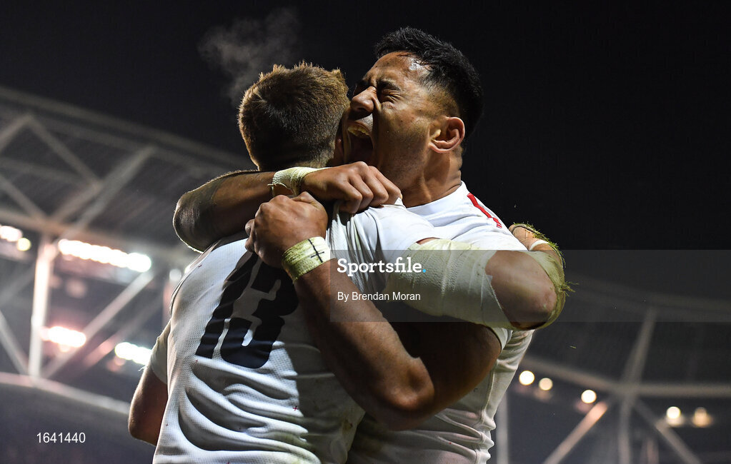 2 February 2019; Henry Slade of England celebrates after scoring his side's third try with teammate Manu Tuilagi during the Guinness Six Nations Rugby Championship match between Ireland and England in the Aviva Stadium in Dublin. Photo by Brendan Moran/Sportsfile