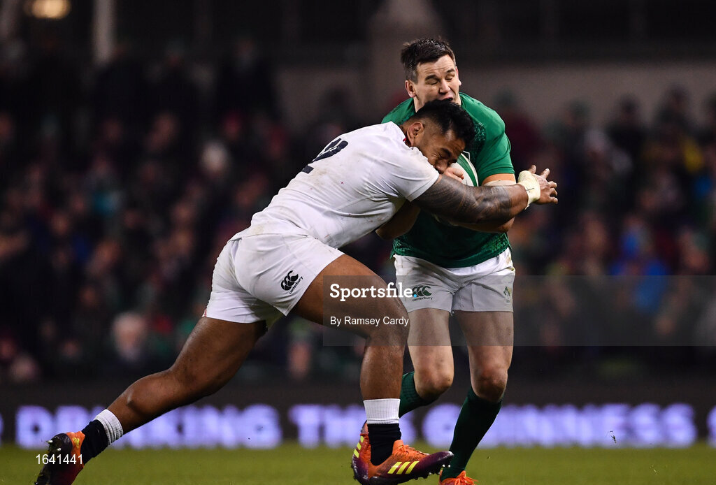 2 February 2019; Jonathan Sexton of Ireland is tackled by Manu Tuilagi of England during the Guinness Six Nations Rugby Championship match between Ireland and England in the Aviva Stadium in Dublin. Photo by Ramsey Cardy/Sportsfile