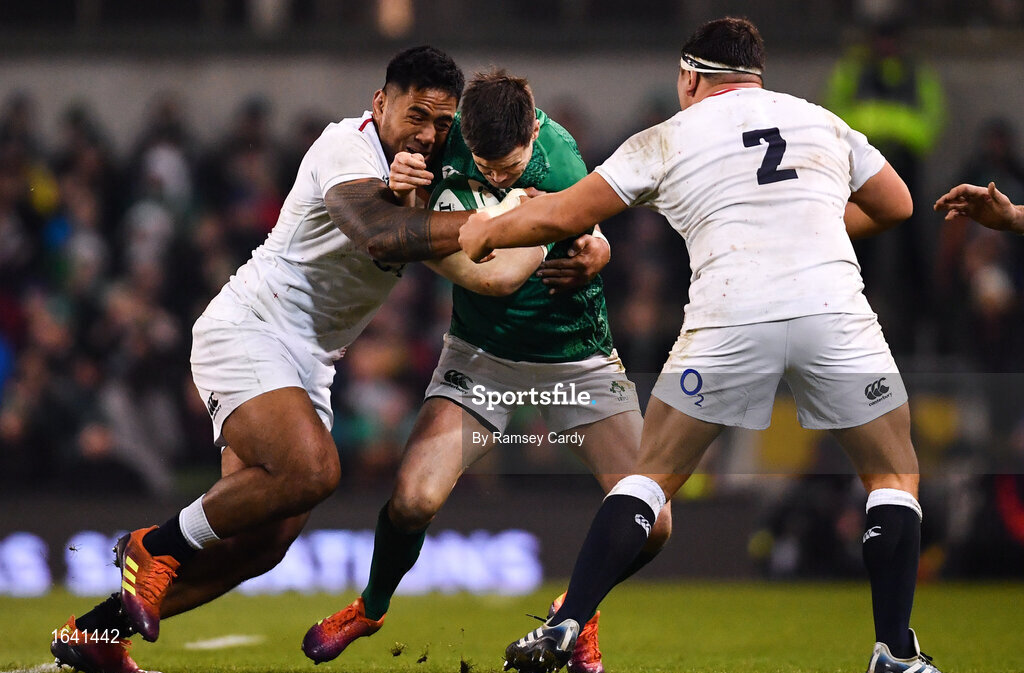 2 February 2019; Jonathan Sexton of Ireland is tackled by Manu Tuilagi, left, and Jamie George of England during the Guinness Six Nations Rugby Championship match between Ireland and England in the Aviva Stadium in Dublin. Photo by Ramsey Cardy/Sportsfile