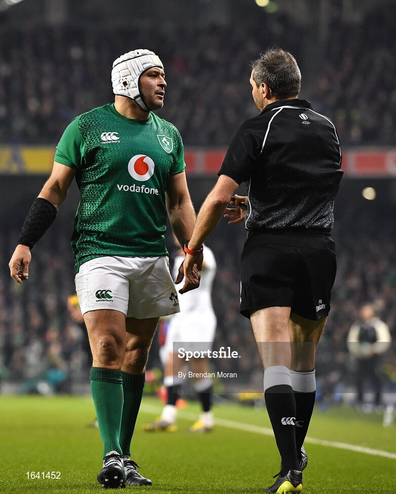 2 February 2019; Ireland captain Rory Best attempts to speak to referee Jérôme Garcès following England's third try during the Guinness Six Nations Rugby Championship match between Ireland and England in the Aviva Stadium in Dublin. Photo by Brendan Moran/Sportsfile