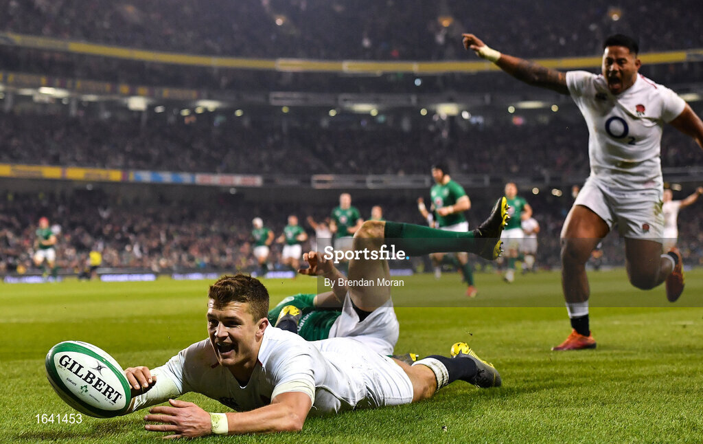 2 February 2019; Henry Slade of England celebrates after scoring his side's third try during the Guinness Six Nations Rugby Championship match between Ireland and England in the Aviva Stadium in Dublin. Photo by Brendan Moran/Sportsfile