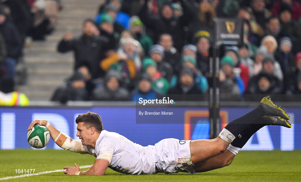 2 February 2019; Henry Slade of England dives over to score his side's fourth try during the Guinness Six Nations Rugby Championship match between Ireland and England in the Aviva Stadium in Dublin. Photo by Brendan Moran/Sportsfile