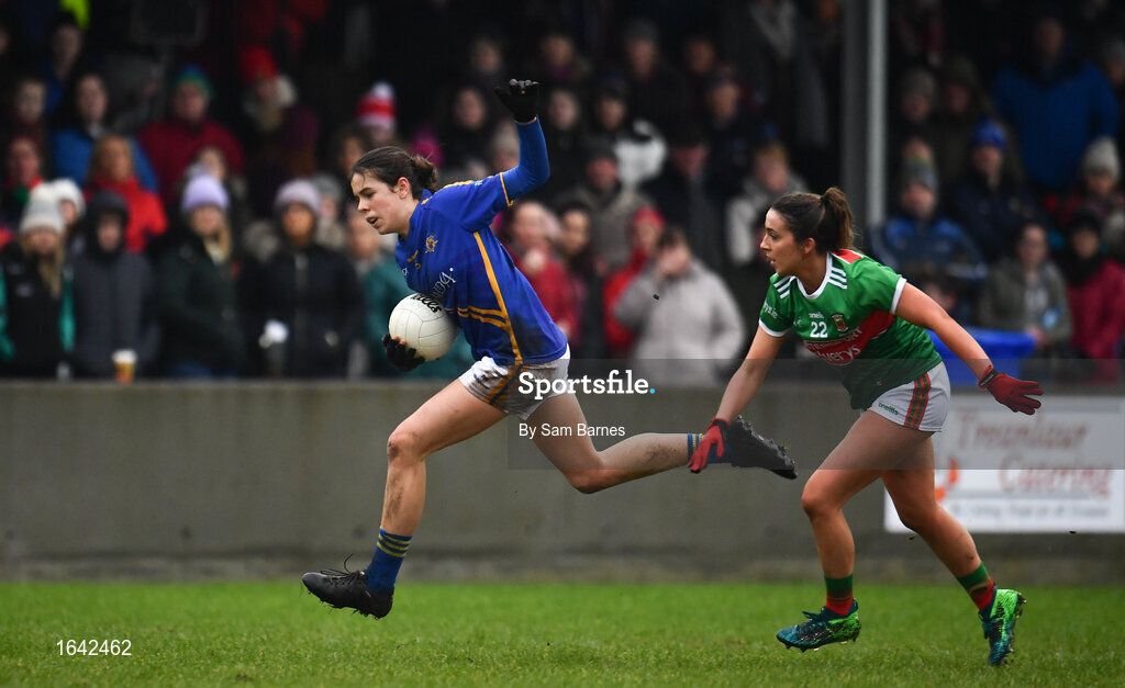 3 February 2019; Anna Rose Kennedy of Tipperary in action against Feena McManamon of Mayo during the Lidl Ladies Football National League Division 1 Round 1 match between Mayo and Tipperary at Swinford Amenity Park in Swinford, Co. Mayo. Photo by Sam Barnes/Sportsfile
