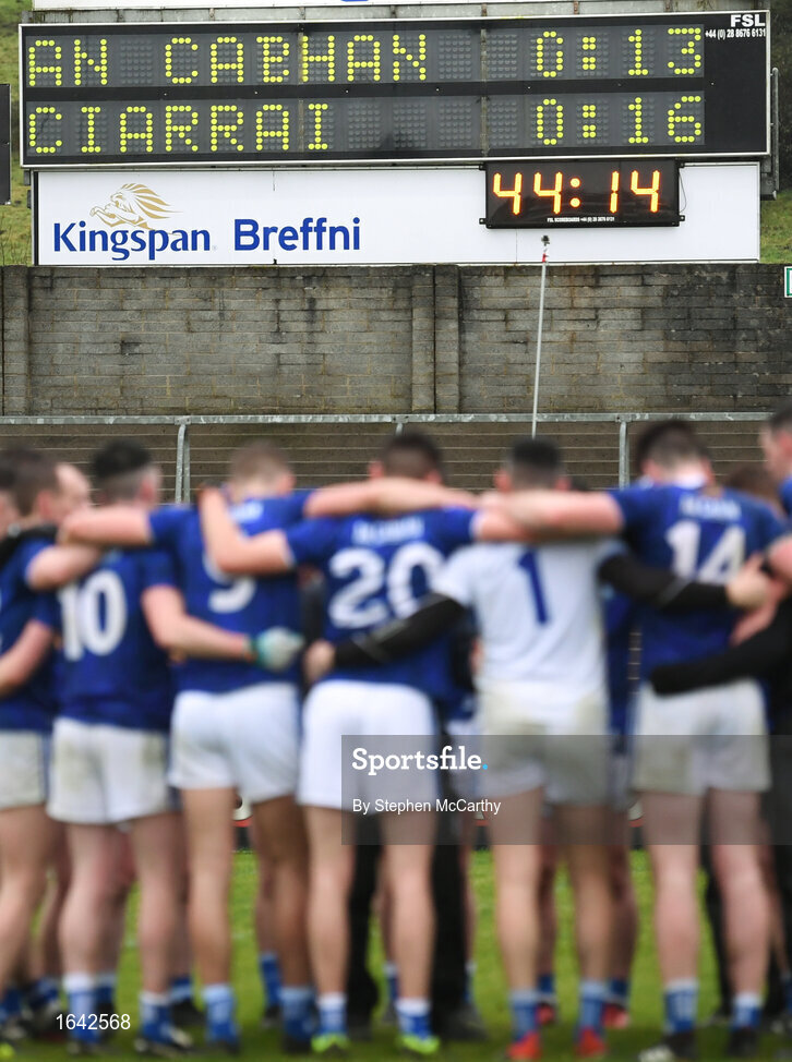 3 February 2019; Cavan players huddle together under the scoreboard following the Allianz Football League Division 1 Round 2 match between Cavan and Kerry at Kingspan Breffni in Cavan. Photo by Stephen McCarthy/Sportsfile