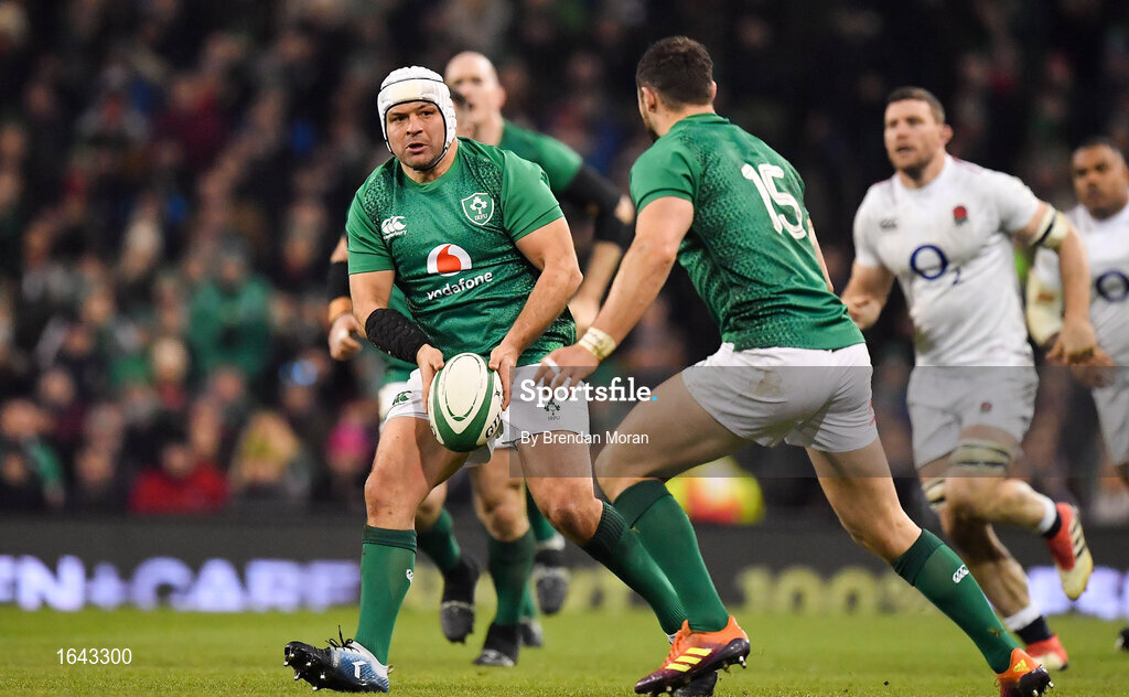 2 February 2019; Rory Best of Ireland passes to team-mate Robbie Henshaw during the Guinness Six Nations Rugby Championship match between Ireland and England in the Aviva Stadium in Dublin. Photo by Brendan Moran/Sportsfile