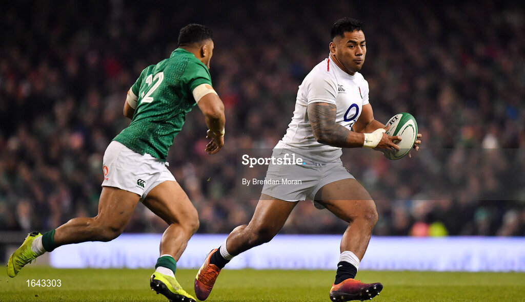 2 February 2019; Manu Tuilagi of England in action against Bundee Aki of Ireland during the Guinness Six Nations Rugby Championship match between Ireland and England in the Aviva Stadium in Dublin. Photo by Brendan Moran/Sportsfile