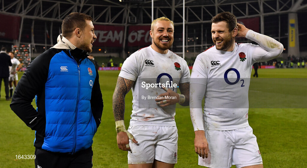 2 February 2019; England players, from left, Mike Brown, Jack Nowell and Elliot Daly after the Guinness Six Nations Rugby Championship match between Ireland and England in the Aviva Stadium in Dublin. Photo by Brendan Moran/Sportsfile