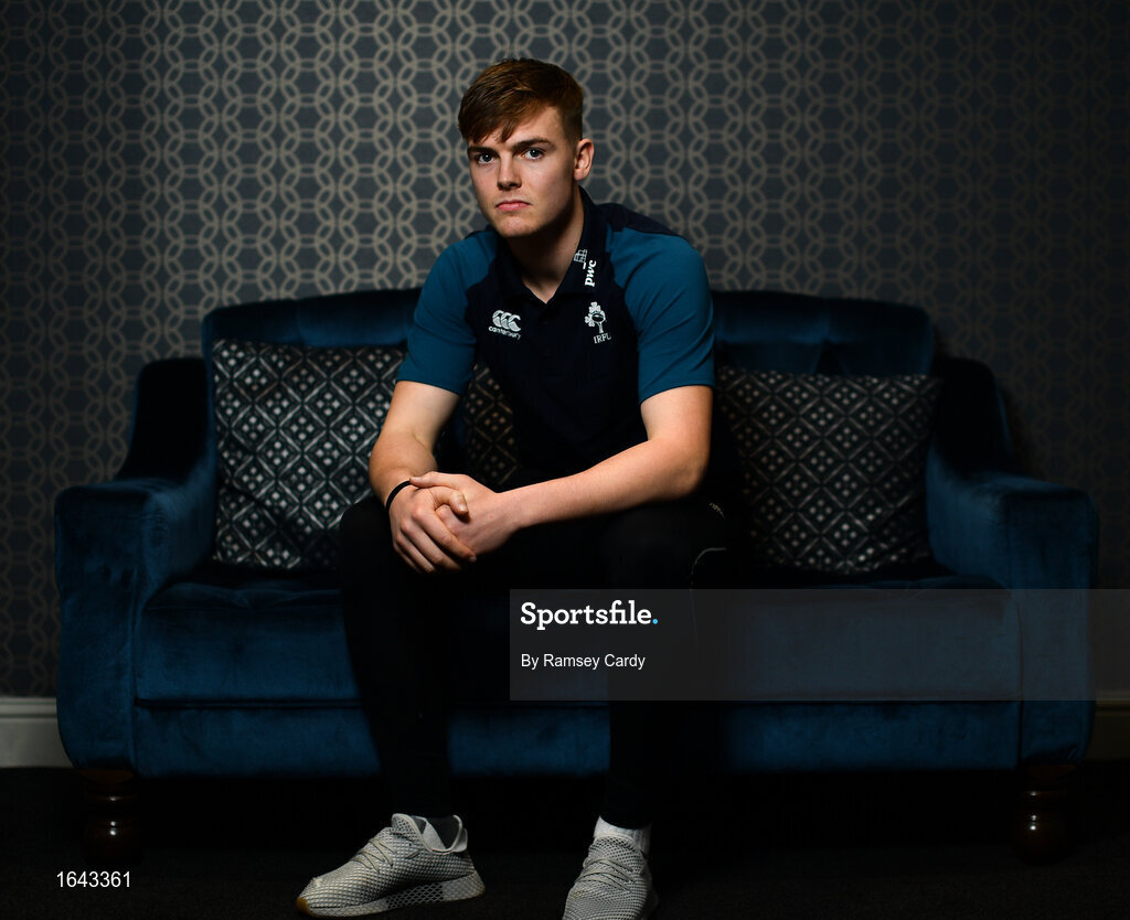 4 February 2019; Jake Flannery poses for a portrait ahead of an Ireland Under 20 Rugby press conference at the Sandymount Hotel in Dublin. Photo by Ramsey Cardy/Sportsfile