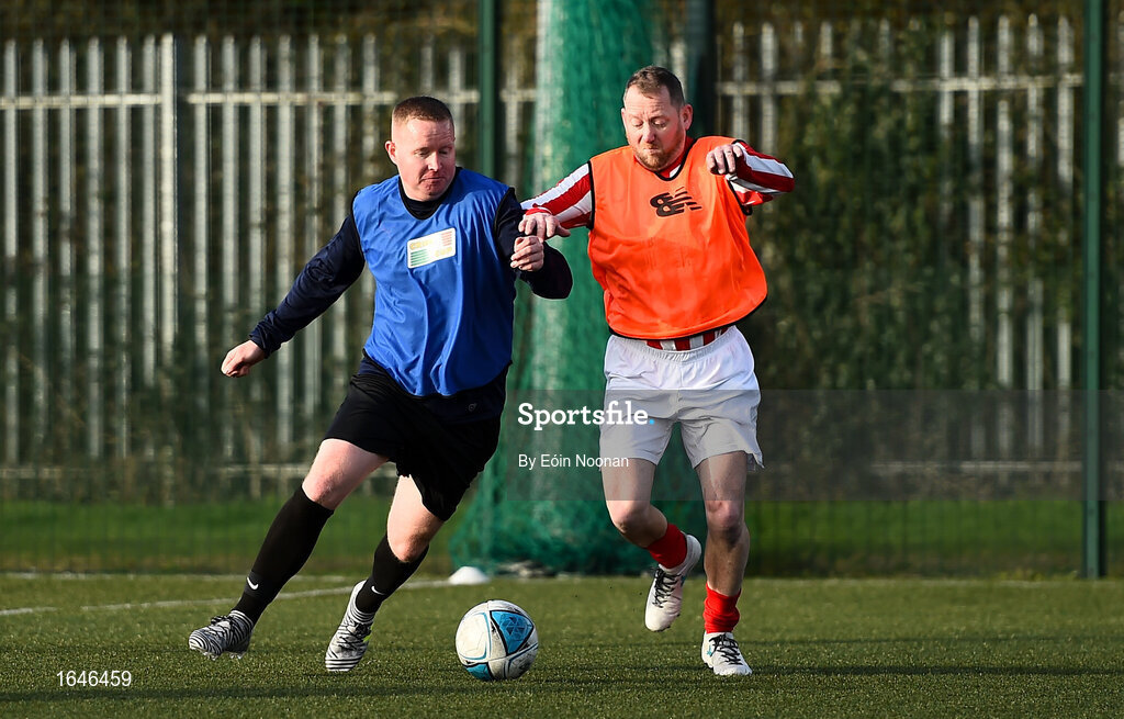 9 February 2019; Peter Doherty of Derry in action against Brian Davis of Wexford during the Confederation of Republic of Ireland Supporters Clubs Cup at Leah Victoria Park in Tullamore Town FC, Offaly. Photo by Eóin Noonan/Sportsfile