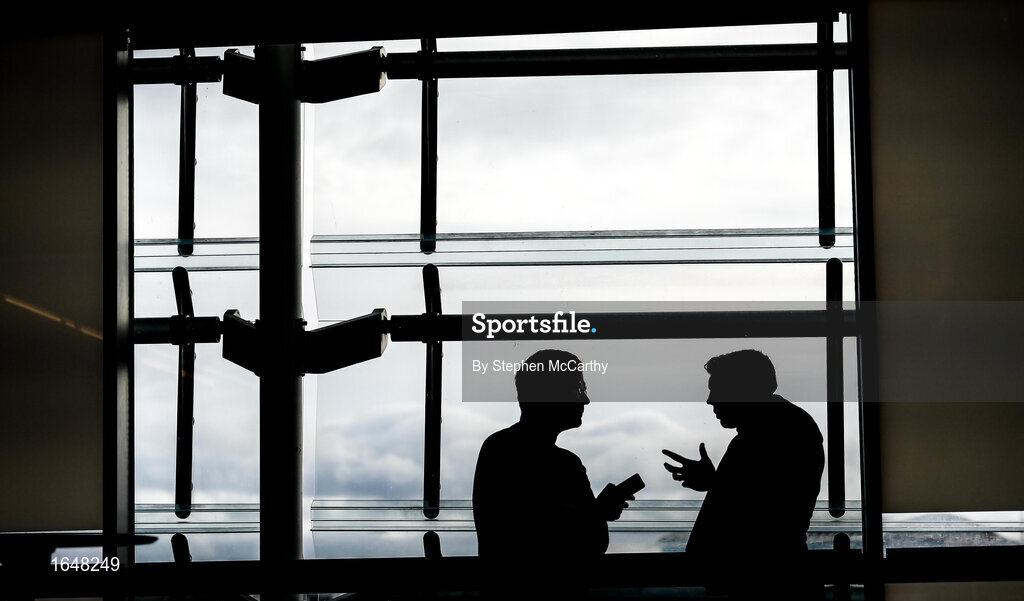 12 February 2019; Dundalk captain Brian Gartland speaks to Emmet Malone of The Irish Times during the launch of the 2019 SSE Airtricity League season at the Aviva Stadium, Lansdowne Road in Dublin. Photo by Stephen McCarthy/Sportsfile