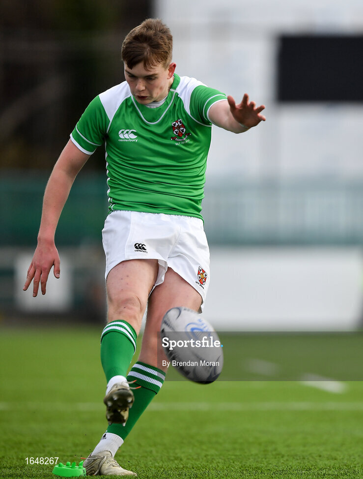 12 February 2019; Jack Connolly of Gonzaga College kicks a conversion during the Bank of Ireland Leinster Schools Senior Cup Round 2 match between Gonzaga College and Terenure College at Energia Park in Donnybrook, Dublin. Photo by Brendan Moran/Sportsfile