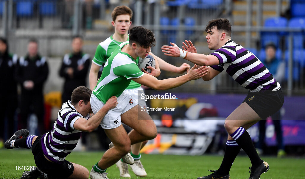 12 February 2019; Karl Morgan of Gonzaga College is tackled by Henry Roberts, left, and Matthew McGettrick of Terenure College during the Bank of Ireland Leinster Schools Senior Cup Round 2 match between Gonzaga College and Terenure College at Energia Park in Donnybrook, Dublin. Photo by Brendan Moran/Sportsfile