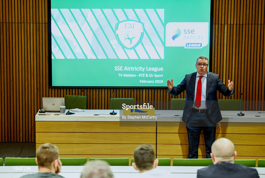 12 February 2019; Declan McBennett, RTÉ Group Head of Sport, speaking during a workshop at the launch of the 2019 SSE Airtricity League season at the Aviva Stadium, Lansdowne Road in Dublin. Photo by Stephen McCarthy/Sportsfile