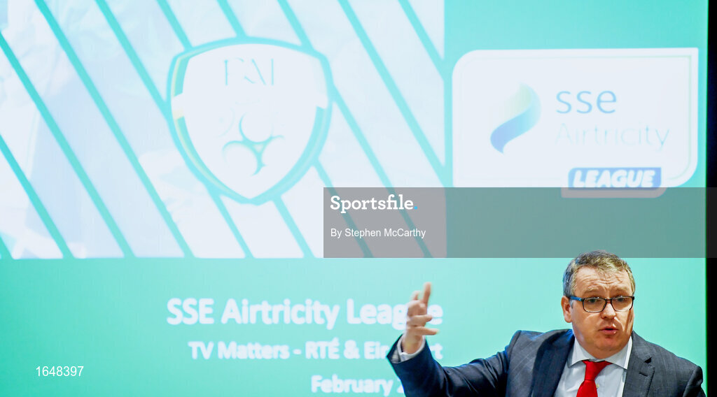 12 February 2019; Declan McBennett, RTÉ Group Head of Sport, speaking during a workshop at the launch of the 2019 SSE Airtricity League season at the Aviva Stadium, Lansdowne Road in Dublin. Photo by Stephen McCarthy/Sportsfile