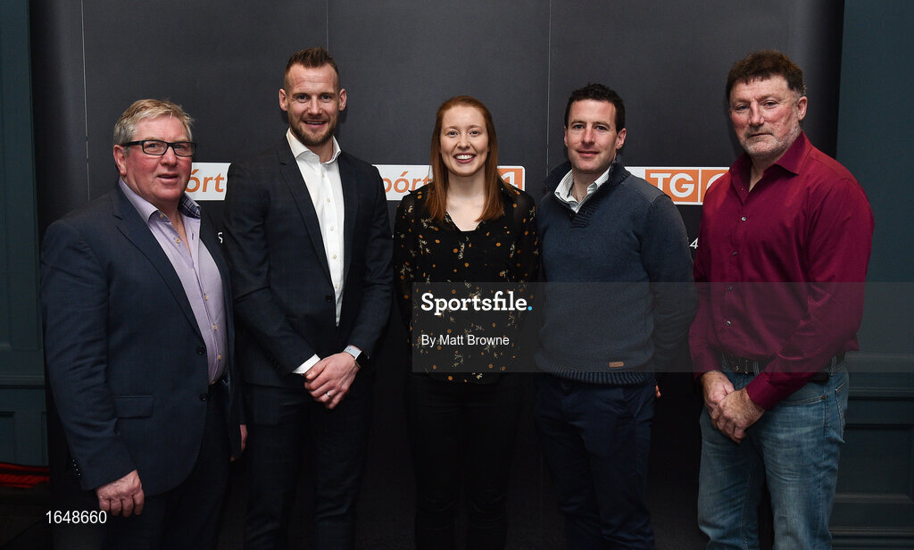 13 February 2019; Former Cork camogie and football player Rena Buckley with, from left, former Offaly footballer Seamus Darby, former Kilkenny hurler Jackie Tyrrell, former Limerick hurler Andrew O'Shaughnessy and former Dublin footballer Kieran Duff in attendance at the Laochra Gael Launch at the Dean Hotel in Dublin. Photo by Matt Browne/Sportsfile
