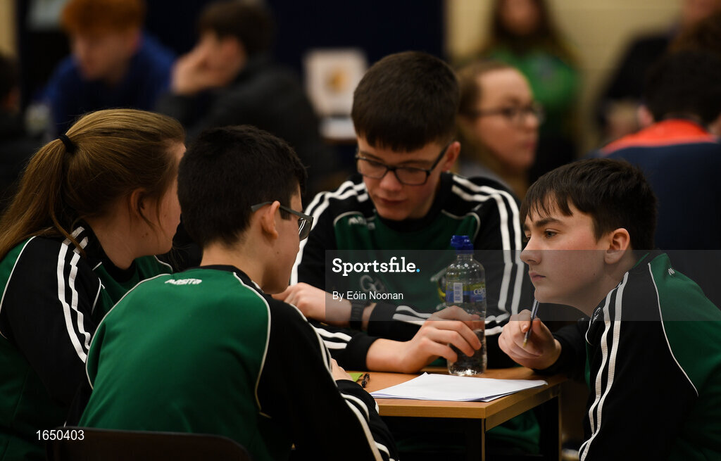 16 February 2019; Louth team from Naomh Máirtín, Tom Gray, Jack Lynch, Hannah McGrory and Conor Maguire taking part in the Tráth na gCéisteann Boird during the Cream of The Crop at Scór na nÓg All Ireland Finals at St Gerards De La Salle Secondary School in Castlebar, Co Mayo. Photo by Eóin Noonan/Sportsfile