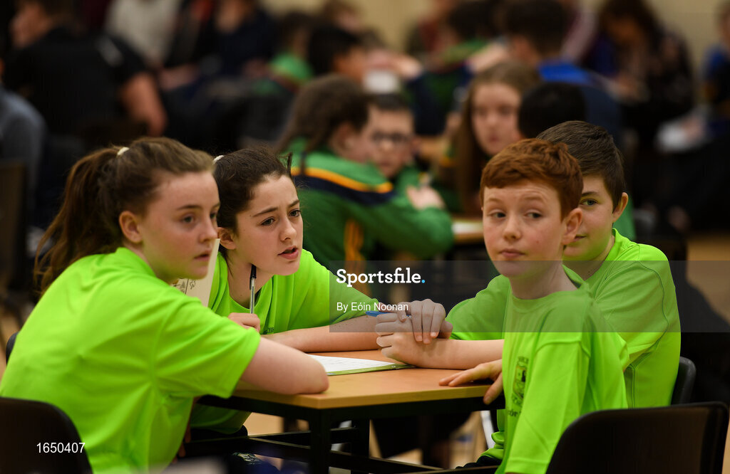 16 February 2019; Clare team from Wolfe Tones na Sionna, Millie Keane, Ronan Walsh, Shane Mulrooney and Darragh Riordan taking part in the Tráth na gCéisteann Boird during the Cream of The Crop at Scór na nÓg All Ireland Finals at St Gerards De La Salle Secondary School in Castlebar, Co Mayo. Photo by Eóin Noonan/Sportsfile