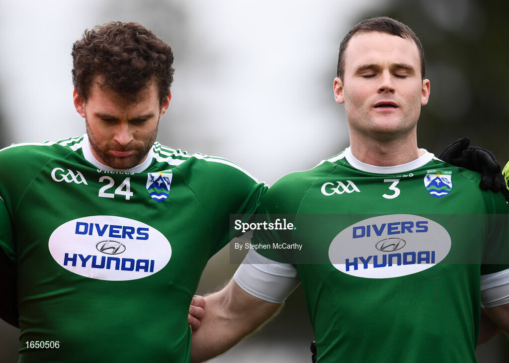 16 February 2019; Gaoth Dobhair players Éamonn Mac Aoidh, left, and Niall Mac Aoidh during a moments silence prior to the AIB GAA Football All-Ireland Senior Championship Semi-Final match between Corofin, Galway, and Gaoth Dobhair, Donegal, at Avantcard Páirc Sean Mac Diarmada in Carrick-on-Shannon, Leitrim. Photo by Stephen McCarthy/Sportsfile