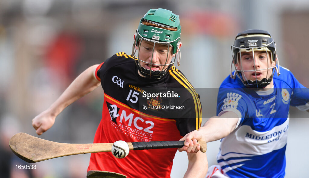 16 February 2019; Jack Cahalane of CBC Cork in action against Cormac O'Brien of Midleton CBS during the Harty Cup Final match between CBC Cork and Midleton CBS at Páirc Uí Rinn in Cork. Photo by Piaras Ó Mídheach/Sportsfile