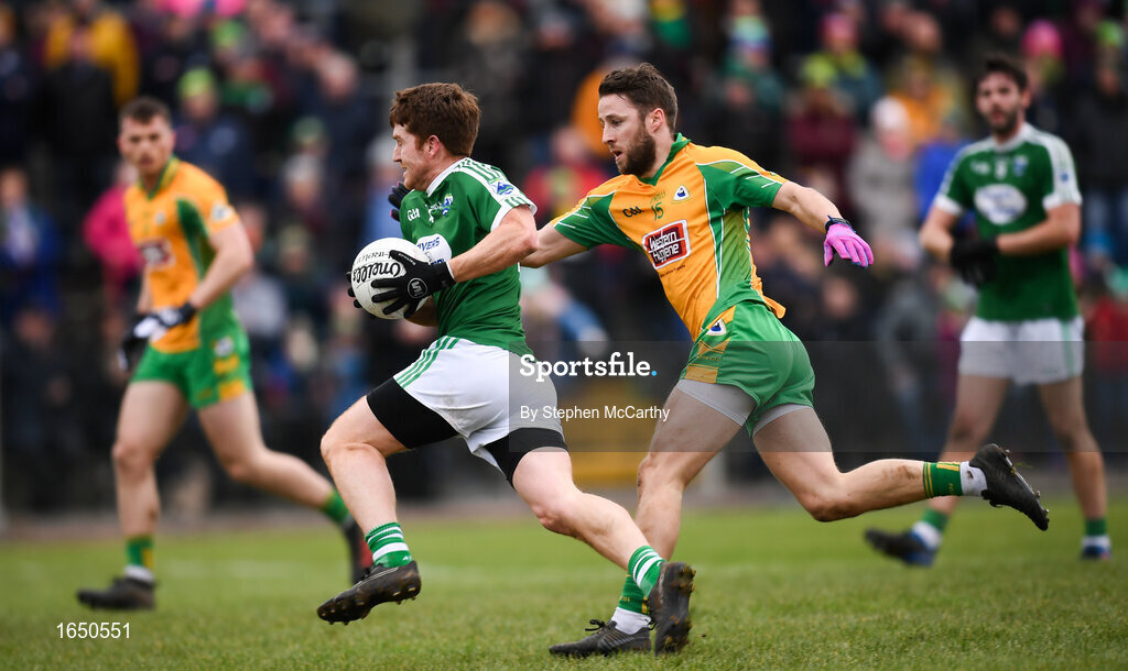 16 February 2019; Criostóir Mac Pháidín of Gaoth Dobhair in action against Micheál Lundy of Corofin during the AIB GAA Football All-Ireland Senior Championship Semi-Final match between Corofin, Galway, and Gaoth Dobhair, Donegal, at Avantcard Páirc Sean Mac Diarmada in Carrick-on-Shannon, Leitrim. Photo by Stephen McCarthy/Sportsfile