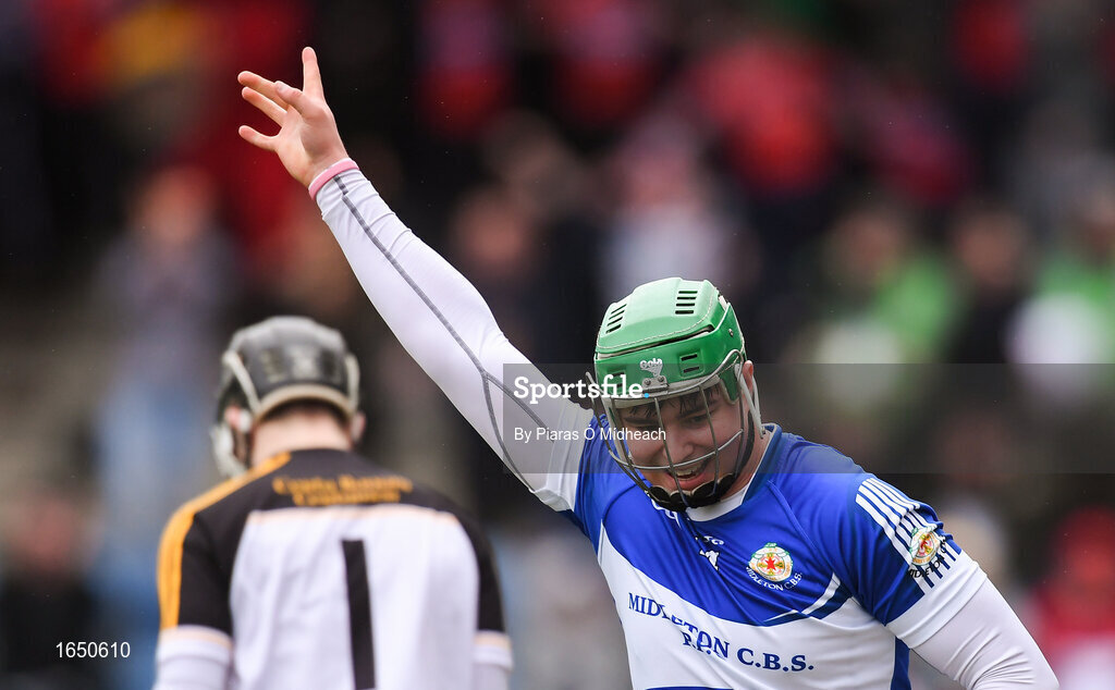16 February 2019; Joe Stack of Midleton CBS celebrates scoring his side's second goal during the Harty Cup Final match between CBC Cork and Midleton CBS at Páirc Uí Rinn in Cork. Photo by Piaras Ó Mídheach/Sportsfile