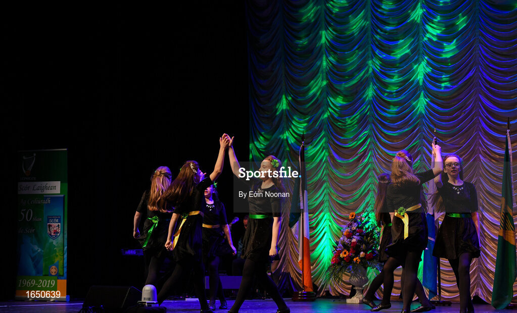 16 February 2019; Leinster team from Kilcormac-Killoughey, Offaly, Elizabeth Kilmartin, Ciara Kilmartin, Caoimhe Quinn, Elaine Lynch, Aideen Quinn, Ciara Barnett Nic Cána, Roisin Monaghan and Orla Kilmartin competing in the Rince Foirne category during the Cream of The Crop at Scór na nÓg All Ireland Finals at St Gerards De La Salle Secondary School in Castlebar, Co Mayo. Photo by Eóin Noonan/Sportsfile