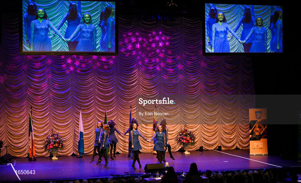 16 February 2019; Connacht team from St.Dominic’s, Roscommon, Anna Campbell, Aine Cassidy, Emma Connaughton, Niamh Fitzgerald, Iona Hanley, Roisin Kenny, Laoise Mahon, Ciara Roddy and Molly Anne Feeley competing in the Rince Foirne category during the Cream of The Crop at Scór na nÓg All Ireland Finals at St Gerards De La Salle Secondary School in Castlebar, Co Mayo. Photo by Eóin Noonan/Sportsfile