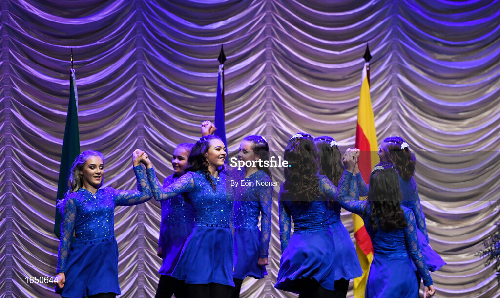 16 February 2019; Connacht team from St.Dominic’s, Roscommon, Anna Campbell, Aine Cassidy, Emma Connaughton, Niamh Fitzgerald, Iona Hanley, Roisin Kenny, Laoise Mahon, Ciara Roddy and Molly Anne Feeley competing in the Rince Foirne category during the Cream of The Crop at Scór na nÓg All Ireland Finals at St Gerards De La Salle Secondary School in Castlebar, Co Mayo. Photo by Eóin Noonan/Sportsfile