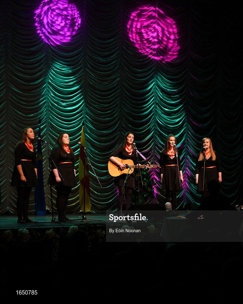 16 February 2019; Munster team from Cullen, Cork, Clodagh O Connor, Maggie Moynihan, Katie O Sullivan, Emily Nagle and Gemma Nagle competing in the Bailéad Ghrúpa catagory during the Cream of The Crop at Scór na nÓg All Ireland Finals at St Gerards De La Salle Secondary School in Castlebar, Co Mayo. Photo by Eóin Noonan/Sportsfile