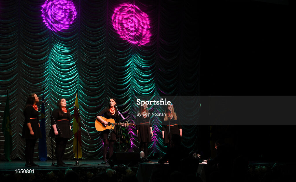16 February 2019; Munster team from Cullen, Cork, Clodagh O Connor, Maggie Moynihan, Katie O Sullivan, Emily Nagle and Gemma Nagle competing in the Bailéad Ghrúpa catagory during the Cream of The Crop at Scór na nÓg All Ireland Finals at St Gerards De La Salle Secondary School in Castlebar, Co Mayo. Photo by Eóin Noonan/Sportsfile