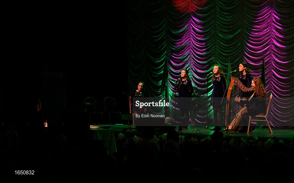 16 February 2019; Connacht team from St. Marys, Leitrim, Ava Brogan, Roisín Noone, Elsie Harman, Eleanor Smith and Rionach Nic Conmara competing in the Bailéad Ghrúpa catagory during the Cream of The Crop at Scór na nÓg All Ireland Finals at St Gerards De La Salle Secondary School in Castlebar, Co Mayo. Photo by Eóin Noonan/Sportsfile