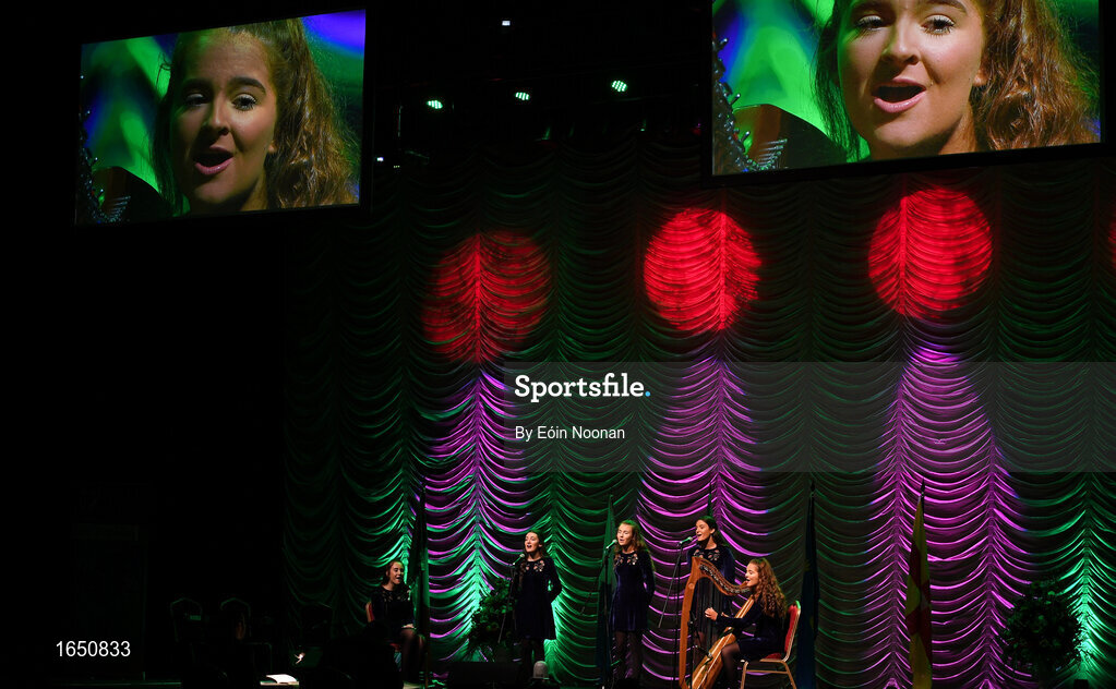 16 February 2019; Connacht team from St. Marys, Leitrim, Ava Brogan, Roisín Noone, Elsie Harman, Eleanor Smith and Rionach Nic Conmara competing in the Bailéad Ghrúpa catagory during the Cream of The Crop at Scór na nÓg All Ireland Finals at St Gerards De La Salle Secondary School in Castlebar, Co Mayo. Photo by Eóin Noonan/Sportsfile