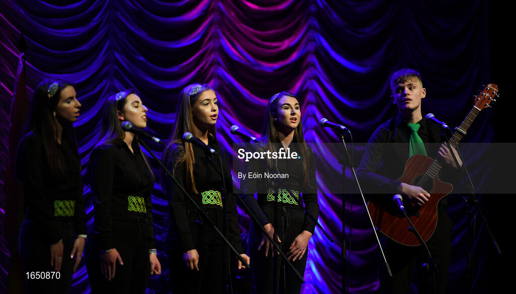 16 February 2019; Ulter team from Watty Graham’s GAC Glen, Derry, Ciarán McKenna, Cora McEldowney, Cliona Convery, Aoife Molloy and Katie McCoy competing in the Bailéad Ghrúpa catagory during the Cream of The Crop at Scór na nÓg All Ireland Finals at St Gerards De La Salle Secondary School in Castlebar, Co Mayo. Photo by Eóin Noonan/Sportsfile