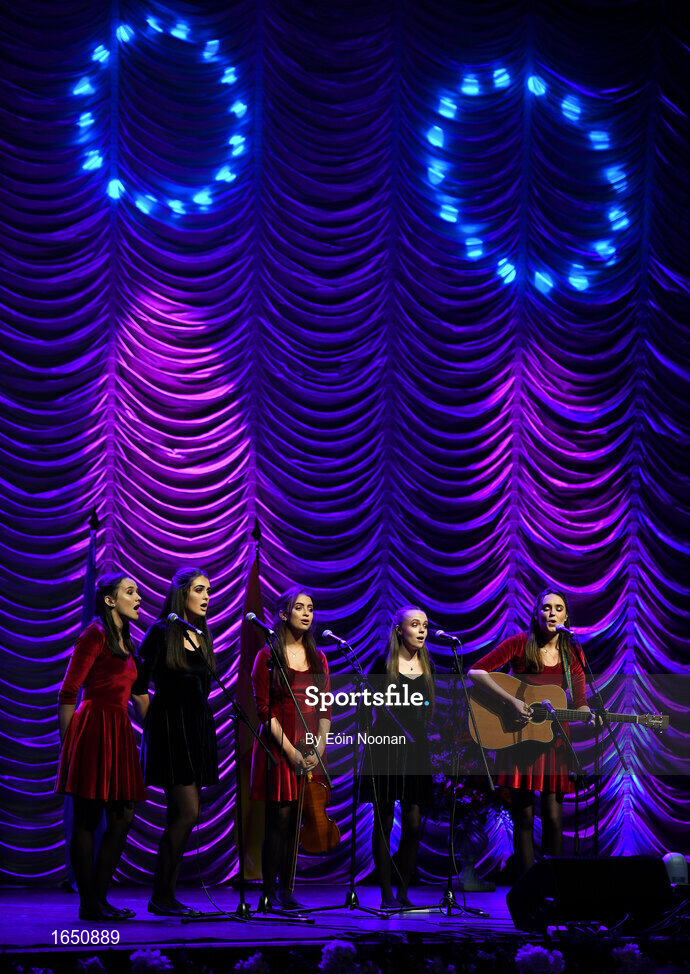 16 February 2019; Leinster team from St. Patrick's, Ardagh, Longford, Aishling Farrell, Siobhán Kilduff, Katie Lynch, Emma Thompson and Leia Nic hAnabaí competing in the Bailéad Ghrúpa catagory during the Cream of The Crop at Scór na nÓg All Ireland Finals at St Gerards De La Salle Secondary School in Castlebar, Co Mayo. Photo by Eóin Noonan/Sportsfile