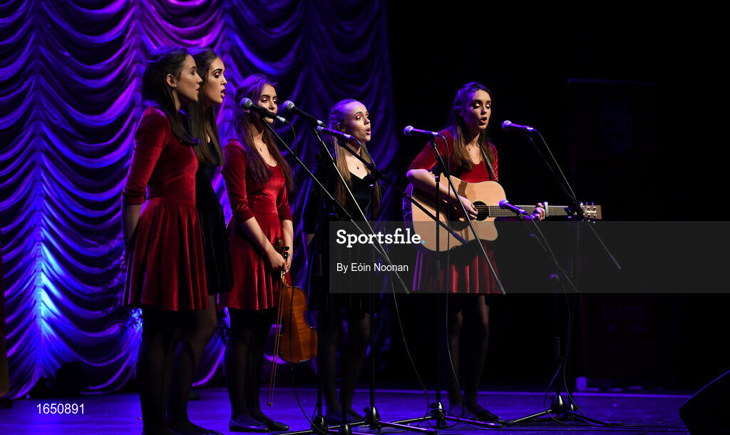 16 February 2019; Leinster team from St. Patrick's, Ardagh, Longford, Aishling Farrell, Siobhán Kilduff, Katie Lynch, Emma Thompson and Leia Nic hAnabaí competing in the Bailéad Ghrúpa catagory during the Cream of The Crop at Scór na nÓg All Ireland Finals at St Gerards De La Salle Secondary School in Castlebar, Co Mayo. Photo by Eóin Noonan/Sportsfile