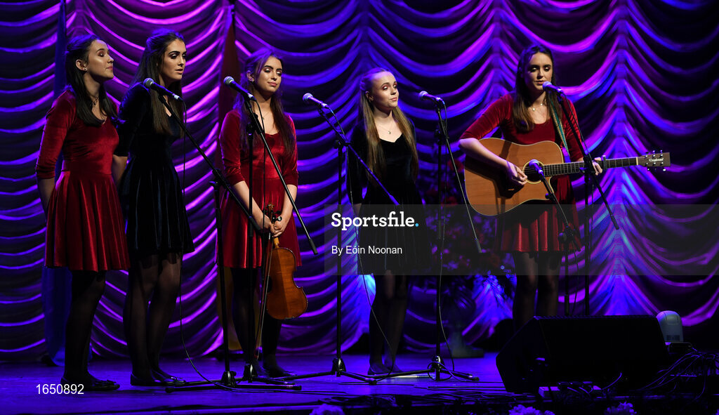 16 February 2019; Leinster team from St. Patrick's, Ardagh, Longford, Aishling Farrell, Siobhán Kilduff, Katie Lynch, Emma Thompson and Leia Nic hAnabaí competing in the Bailéad Ghrúpa catagory during the Cream of The Crop at Scór na nÓg All Ireland Finals at St Gerards De La Salle Secondary School in Castlebar, Co Mayo. Photo by Eóin Noonan/Sportsfile