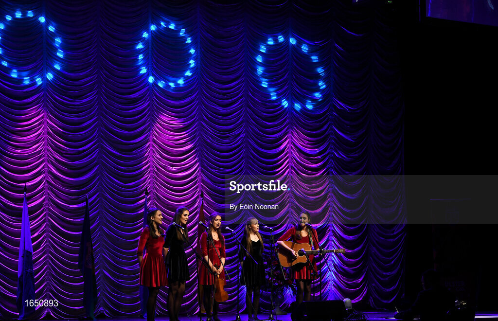 16 February 2019; Leinster team from St. Patrick's, Ardagh, Longford, Aishling Farrell, Siobhán Kilduff, Katie Lynch, Emma Thompson and Leia Nic hAnabaí competing in the Bailéad Ghrúpa catagory during the Cream of The Crop at Scór na nÓg All Ireland Finals at St Gerards De La Salle Secondary School in Castlebar, Co Mayo. Photo by Eóin Noonan/Sportsfile