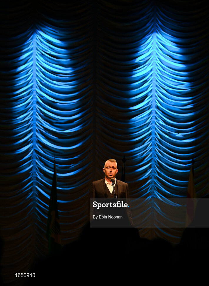 16 February 2019; Fergal Ó Murchú singing Amhrán na bhFiann ahead of the Cream of The Crop at Scór na nÓg All Ireland Finals at St Gerards De La Salle Secondary School in Castlebar, Co Mayo. Photo by Eóin Noonan/Sportsfile