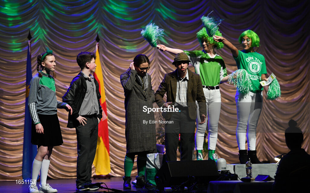 16 February 2019; Munster team from Na Gaeil, Kerry, Aoife O’Sullivan, Áine O’Sullivan, Isabelle Crowe, Emily Crowe, Joshua Roche, Dearbhla Quirke, Rory Reen and Gráinne Quirke competing in the Léiriú catagory during the Cream of The Crop at Scór na nÓg All Ireland Finals at St Gerards De La Salle Secondary School in Castlebar, Co Mayo. Photo by Eóin Noonan/Sportsfile