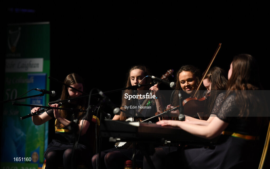 16 February 2019; Leinster team from Kilcormac-Killoughey, Offaly, Aoibhe Dooley, Verona Lynch, Aine Gleeson, Meibh Dooley and Naoise Dooley competing in the Ceol Uirlise catagory during the Cream of The Crop at Scór na nÓg All Ireland Finals at St Gerards De La Salle Secondary School in Castlebar, Co Mayo. Photo by Eóin Noonan/Sportsfile