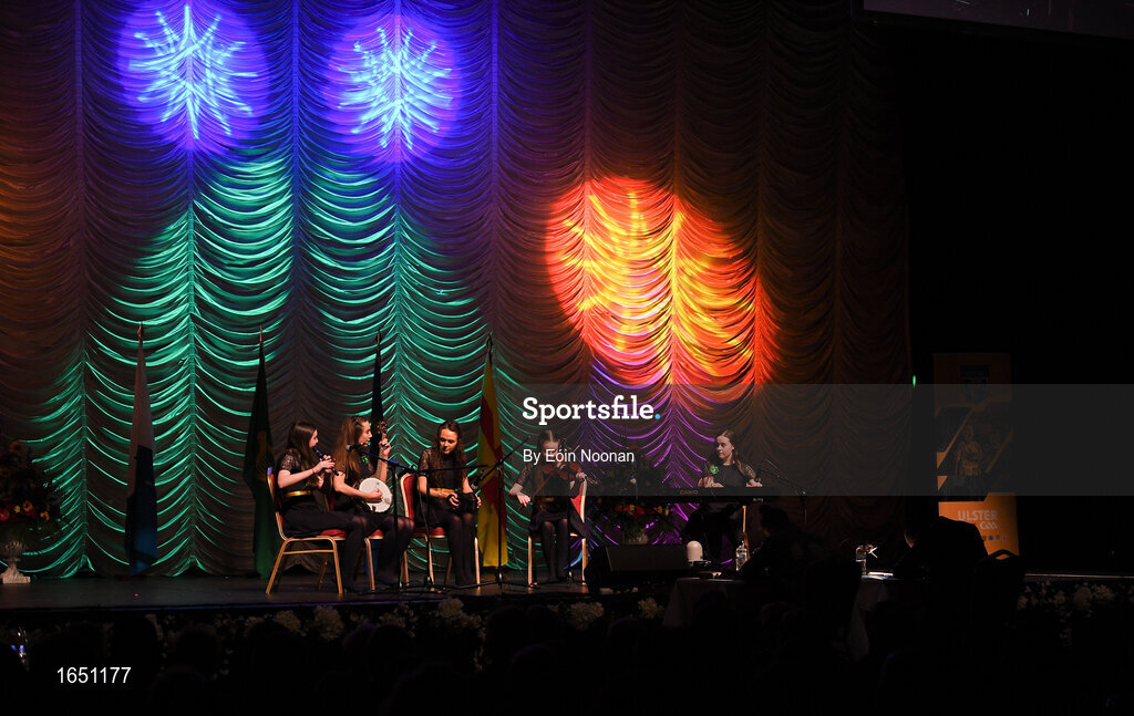16 February 2019; Leinster team from Kilcormac-Killoughey, Offaly, Aoibhe Dooley, Verona Lynch, Aine Gleeson, Meibh Dooley and Naoise Dooley competing in the Ceol Uirlise catagory during the Cream of The Crop at Scór na nÓg All Ireland Finals at St Gerards De La Salle Secondary School in Castlebar, Co Mayo. Photo by Eóin Noonan/Sportsfile