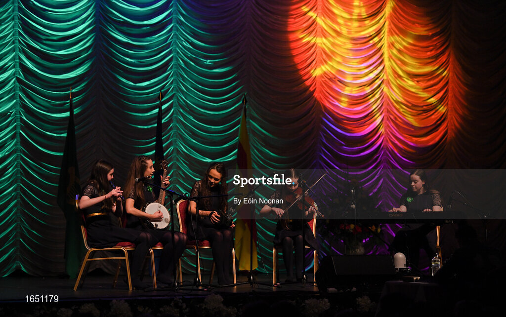 16 February 2019; Leinster team from Kilcormac-Killoughey, Offaly, Aoibhe Dooley, Verona Lynch, Aine Gleeson, Meibh Dooley and Naoise Dooley competing in the Ceol Uirlise catagory during the Cream of The Crop at Scór na nÓg All Ireland Finals at St Gerards De La Salle Secondary School in Castlebar, Co Mayo. Photo by Eóin Noonan/Sportsfile