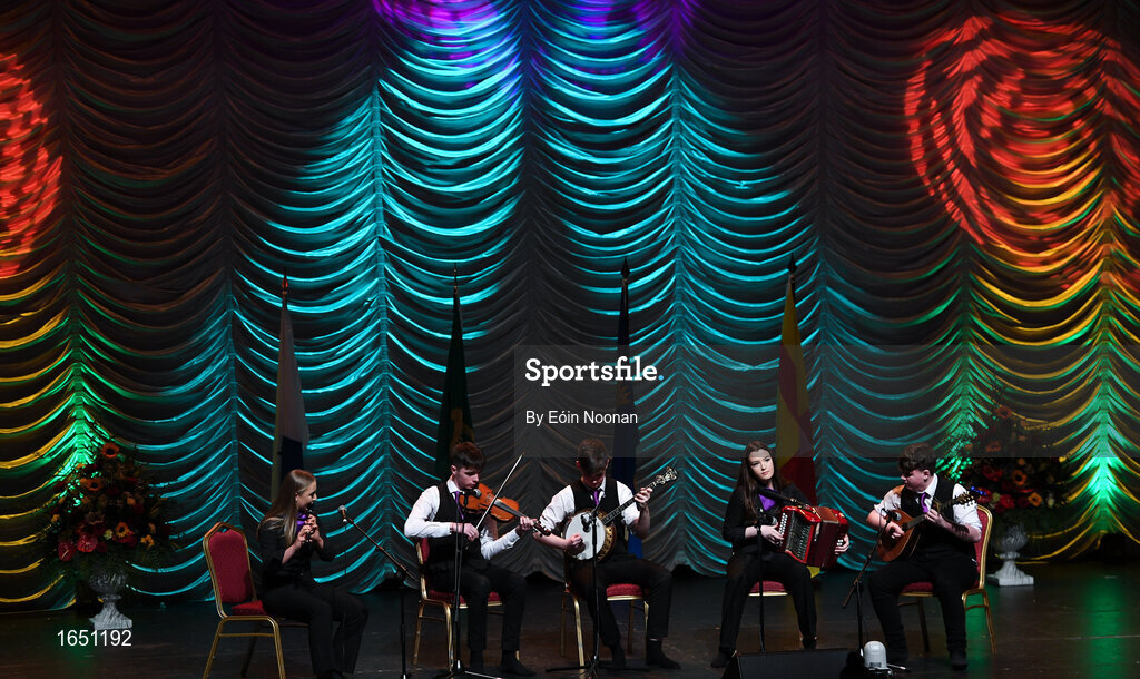 16 February 2019; Munster team from Kilshannig, Cork, Robert Dunne, Marc O Shea, Eoin Turner, Aoife Turner and Sarah Guiney competing in the Ceol Uirlise catagory during the Cream of The Crop at Scór na nÓg All Ireland Finals at St Gerards De La Salle Secondary School in Castlebar, Co Mayo. Photo by Eóin Noonan/Sportsfile