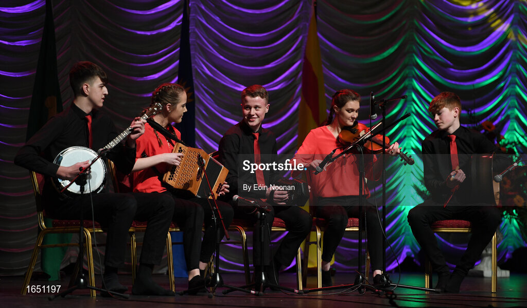 16 February 2019; Connacht team from Corofin, Galway, Caoimhe Kelly, Patrick Egan, Ryan Buckley, Eimhín Mulligan and Katie Harte competing in the Ceol Uirlise catagory during the Cream of The Crop at Scór na nÓg All Ireland Finals at St Gerards De La Salle Secondary School in Castlebar, Co Mayo. Photo by Eóin Noonan/Sportsfile