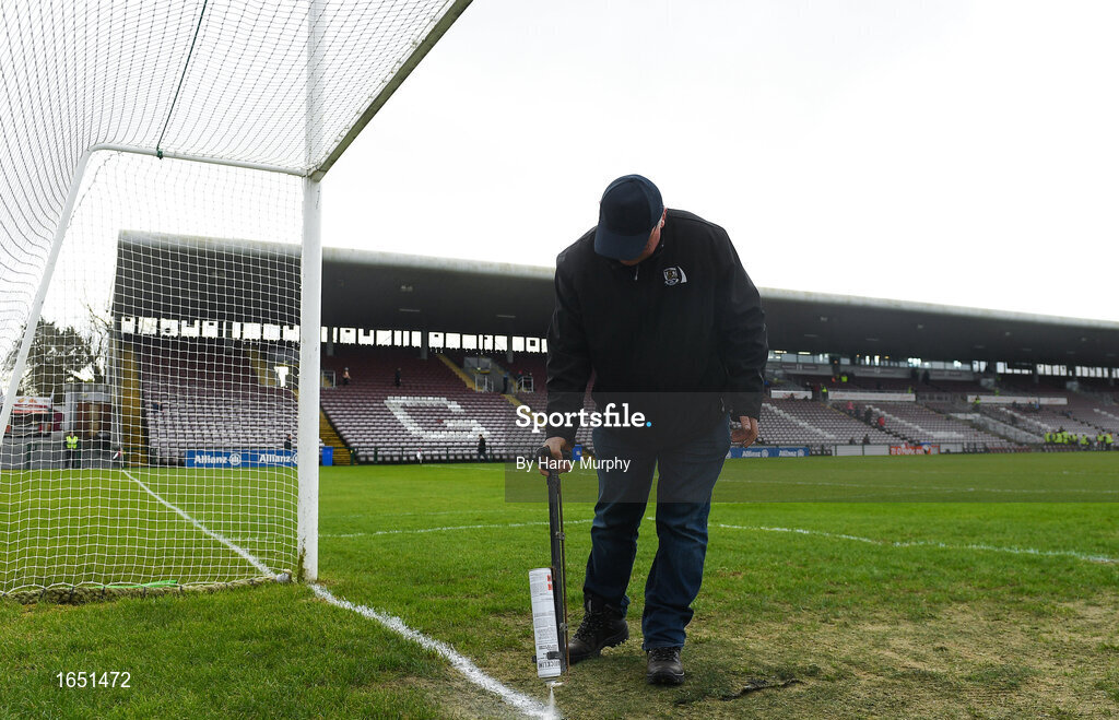 17 February 2019; Groundsman James Flaherty paints the goal line prior to the Allianz Hurling League Division 1B Round 3 match between Galway and Dublin at Pearse Stadium in Salthill, Galway. Photo by Harry Murphy/Sportsfile