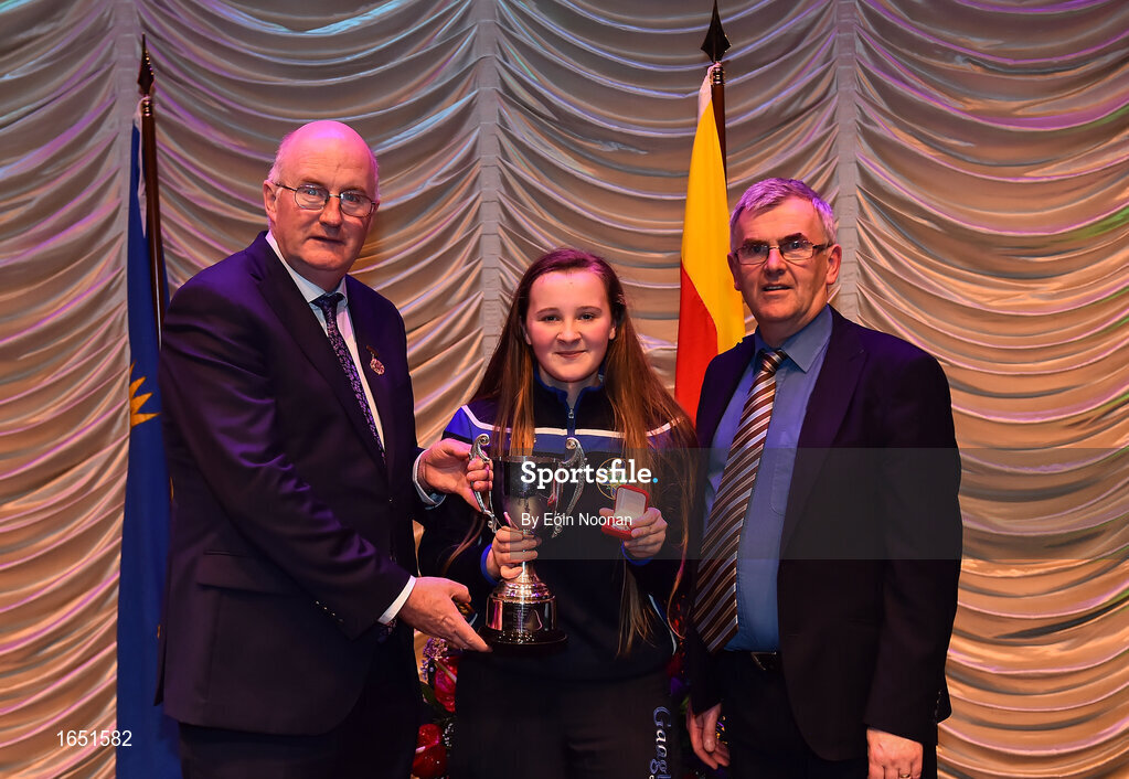 16 February 2019; Mary Kate Bonnes from Tír na nÓg, Randalstown, Antrim, representing Ulster is presented with the trophy by Uachtaráin Cumann Lúthchleas Gael John Horan alongside Aodán Ó Braonáin, Cathaoirleach, after winning the Aithriseoireacht catagory during the Cream of The Crop at Scór na nÓg All Ireland Finals at St Gerards De La Salle Secondary School in Castlebar, Co Mayo. Photo by Eóin Noonan/Sportsfile