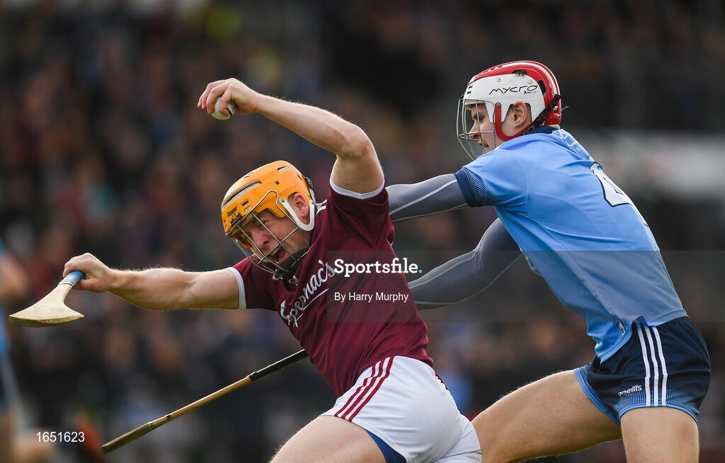 17 February 2019; Davy Glennon of Galway in action against Cian O'Callaghan of Dublin during the Allianz Hurling League Division 1B Round 3 match between Galway and Dublin at Pearse Stadium in Salthill, Galway. Photo by Harry Murphy/Sportsfile