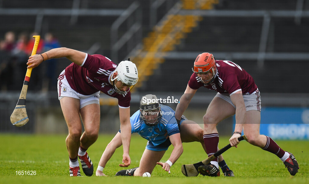 17 February 2019; Jake Malone of Dublin in action against Jason Flynn, left, and Conor Whelan of Galway during the Allianz Hurling League Division 1B Round 3 match between Galway and Dublin at Pearse Stadium in Salthill, Galway. Photo by Harry Murphy/Sportsfile