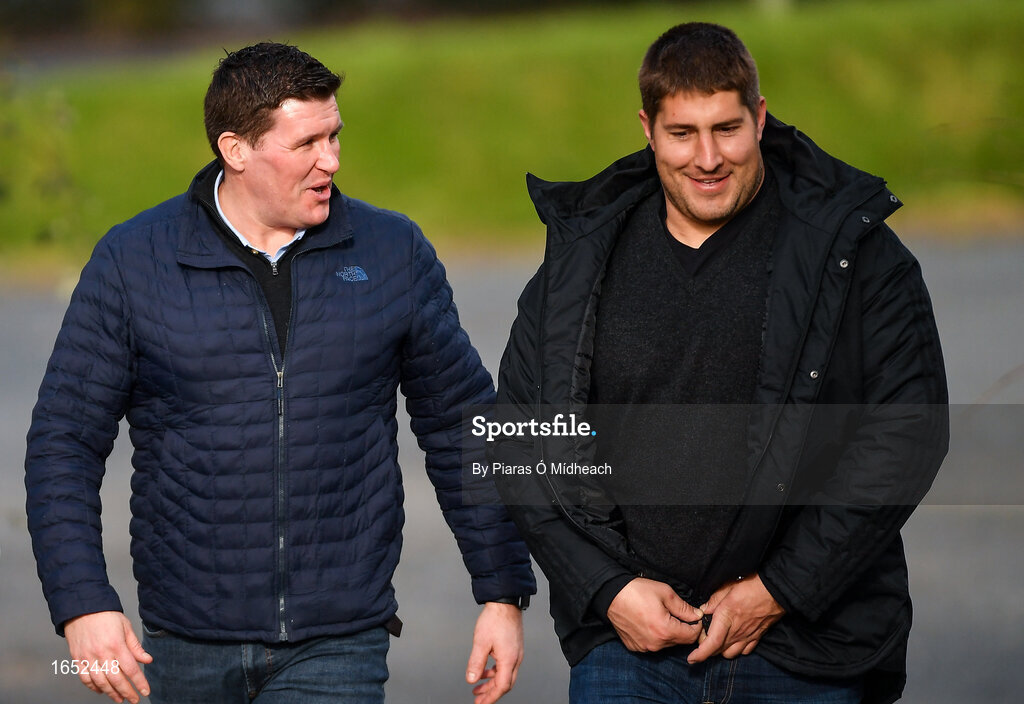 18 February 2019; Atlanta Falcons NFL player Alex Mack, right, and Blackrock rugby coach Mick Carroll arrive for Leinster Rugby Squad Training at Rosemount in UCD, Dublin. Photo by Piaras Ó Mídheach/Sportsfile