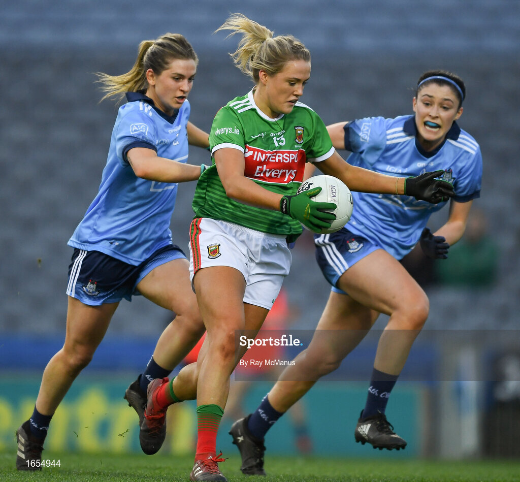 23 February 2019; Fiona Doherty of Mayo races past Martha Byrne, left, and Olwen Carey of Dublin on her way to scoring her side's third goal, in the 20th minute, during the Lidl Ladies NFL Division 1 Round 3 match between Dublin and Mayo at Croke Park in Dublin. Photo by Ray McManus/Sportsfile